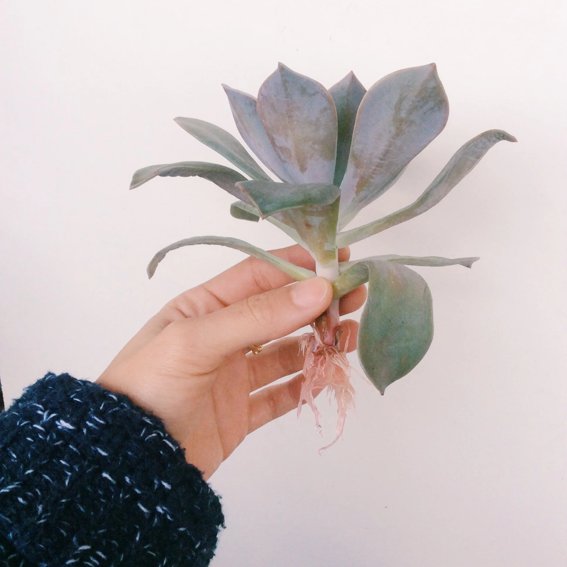 Step 2: Wait a couple of weeks/months until roots start to form, and then a baby succulent will pop out the end of your leaf.